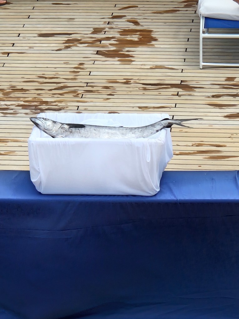 Regatta had its inaugural Pollywog and Shellback ceremony for crossing the equator. It was much tamer than other ones we’ve previously seen or been involved in. The ceremony consists of seafarers (or, in this case, cruise ship passengers and crew) asking King Neptune to be allowed to sail over the equator. To qualify, you have to kiss a fish, get wet and that’s it. Interestingly, I found in my father’s memories a card stating he was now a shellback from his journey on an US warship that took him to Singapore in 1942.