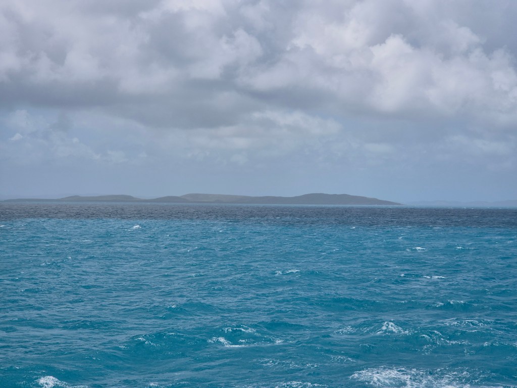 Our next stop was 2 days sailing away, heading east through the Torres Strait, to Papua New Guinea. At midday on day 2 as we passed the tip of Cape Yorke we sailed through the narrowest stretch of water between Australia and Papua New Guinea, some 80 miles distant, in seas barely 50 metres deep. Thousands of years ago, when sea levels were lower, the two land masses were joined and that is when humans walked south over the landbridge from Papua New Guinea into Australia: to becomes today’s indigenous peoples.