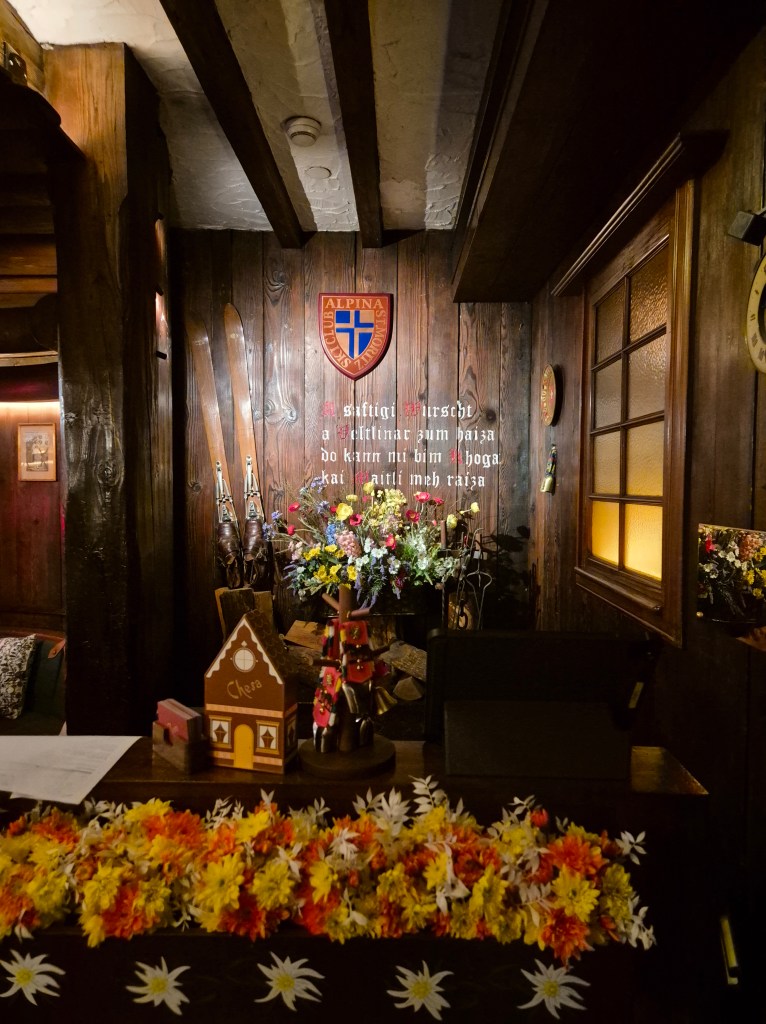 The hotel has a number of restaurants, including Michelin starred Chinese cuisine but we chose the more esoteric option, a “genuine” Alpine experience at the Swiss restaurant, Chesa. The story of how this came about is probably more interesting than the meal itself. The owners spent time in Switzerland and ended up buying an entire bar, had it shipped to Hong Kong in the 1960s, reconstructed and so it remains to this day. Why eat Chinese in Hong Kong when you can have a fondue!