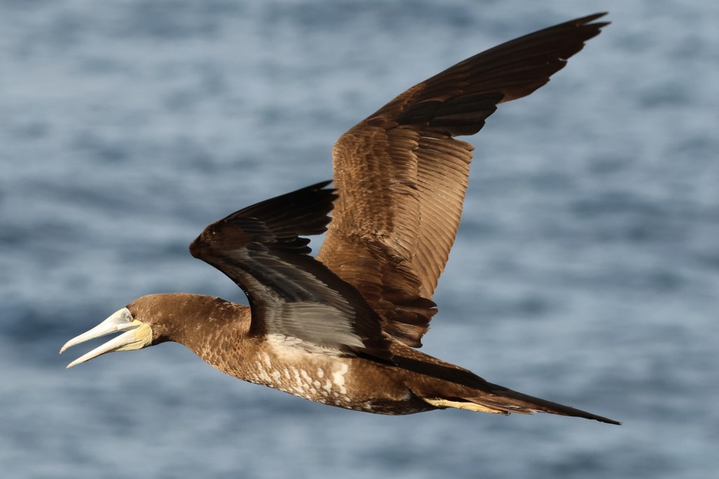 Birds are a rare commodity when at sea: there are many species but with a huge area to feed in they are rarely seen except when we sail through a food-rich area. The other occasion birds are present is when we encounter a species which has learned to capitalise on the disruption created by the ship. In this case, the flying fish disturbed by the boat are eagerly snapped up by a gannet-like species called the Brown booby.